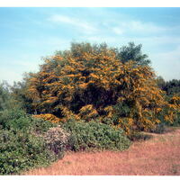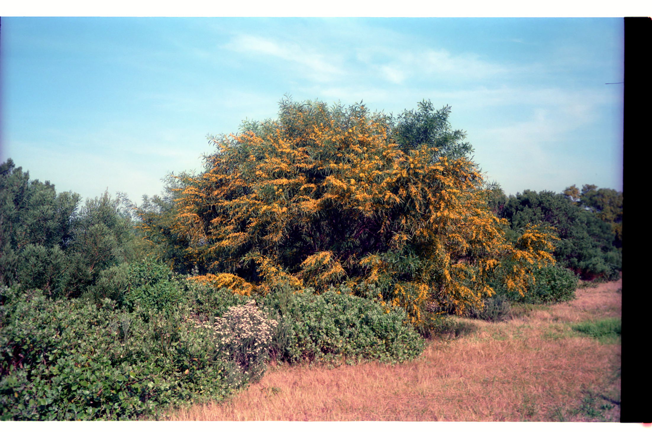 - Encroachment of alien Black Wattle, in flower, into fynbosveld. Indigenous Metalasia and Chrysanthemoides in front, flowering wattle centrally with massed Rooikrans wattle, Acacia cyclops, in background.