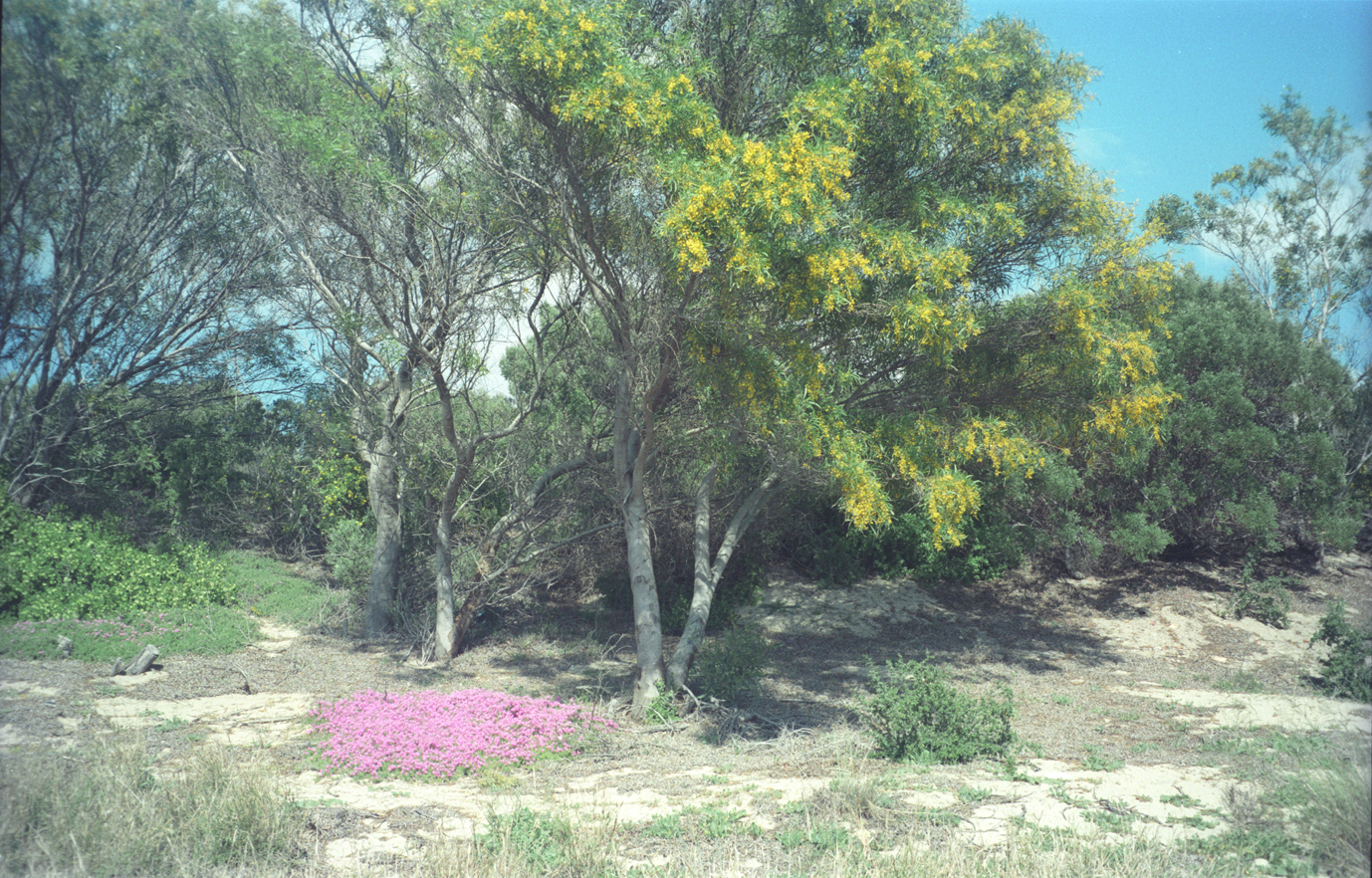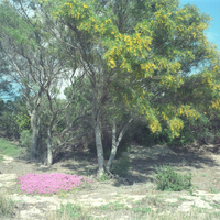 - A fine patch of Drosanthemum vygie in full flower below a flowering Acacia longifolia tree backed by many other Acacias, with left at the edge of the picture a flowering Zygophyllum uitenhagensis. After good spring rains but growing in pure dune sand. All likely to be destroyed by future urban development.