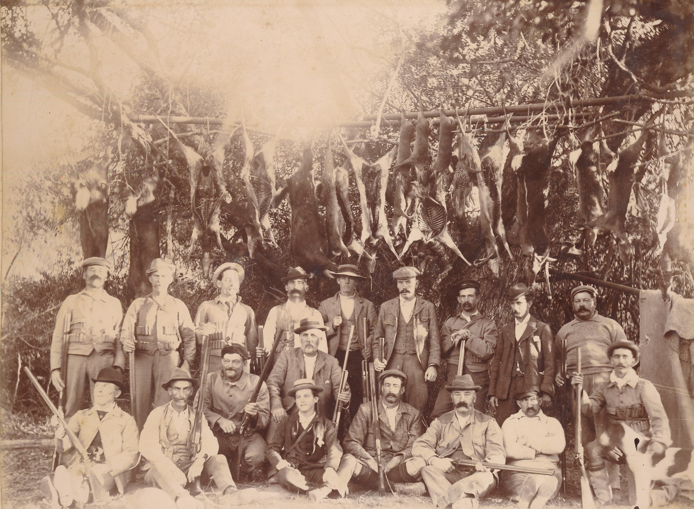 Hunters with their catch on display in the bush