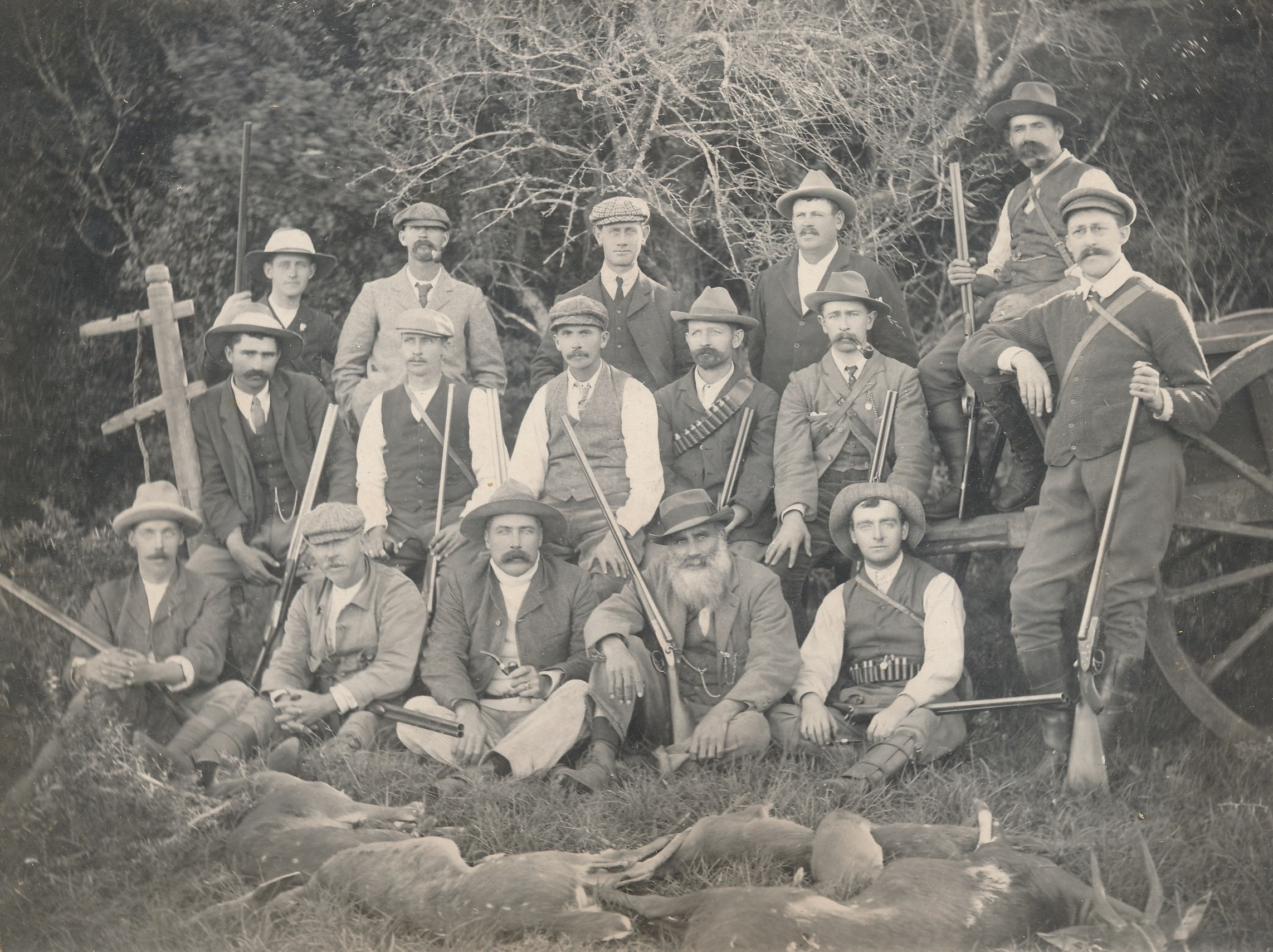 Hunters with rifles and their catch of the day
