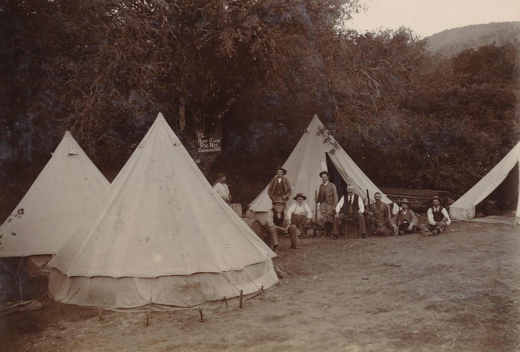 Hunters of the Port Elizabeth Hunt Club sitting in front of sleeping tents