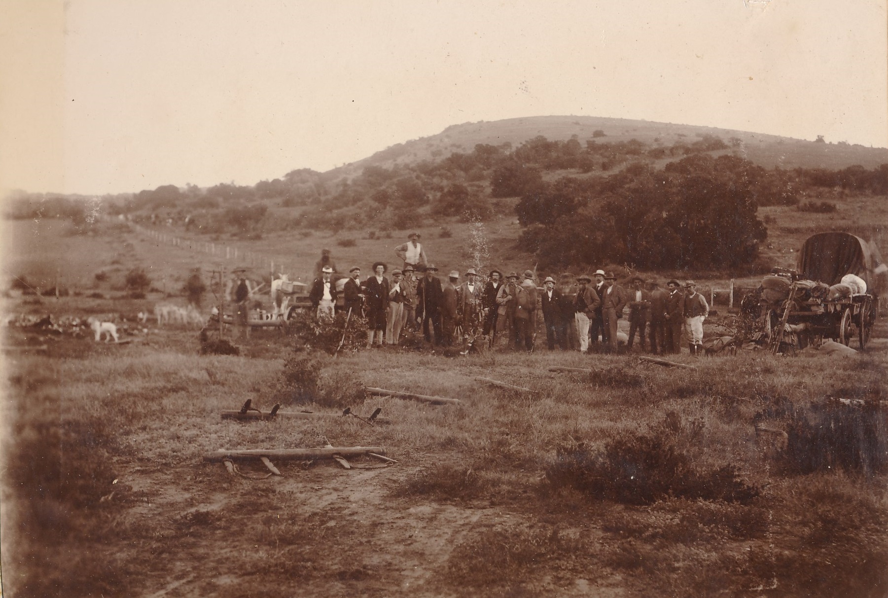 Hunters on a hunting expedition with their dogs and ox wagons