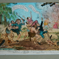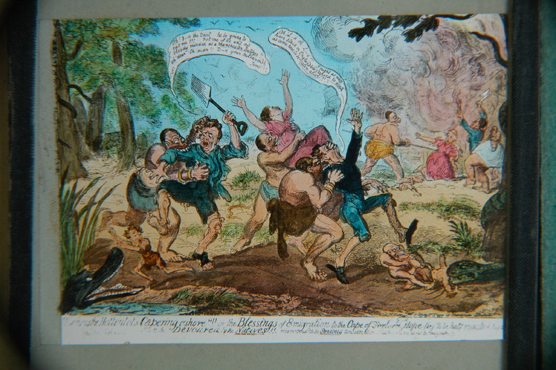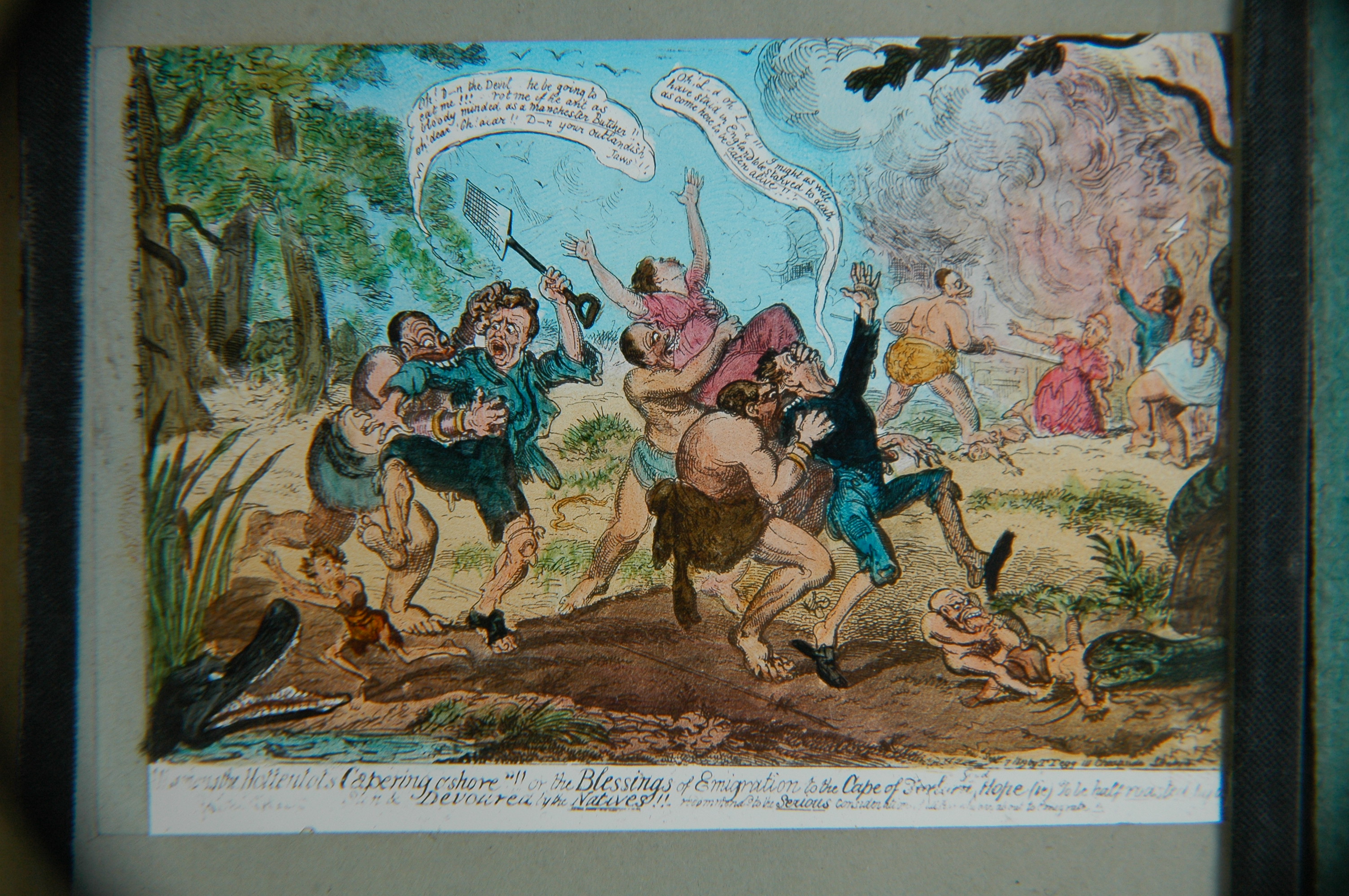 - Cruikshank’s cartoon showing the 1820 Emigration scheme ridiculed.,Transcription reads: "All among the Hottentots Capering ashore!! or the Blessings of Emigration to the Cape of Forlorn Good Hope (ie) To be half roasted by the Sun & Devoured by the Natives!! recommend to the Serious consideration of all those who are about to Emigrate"