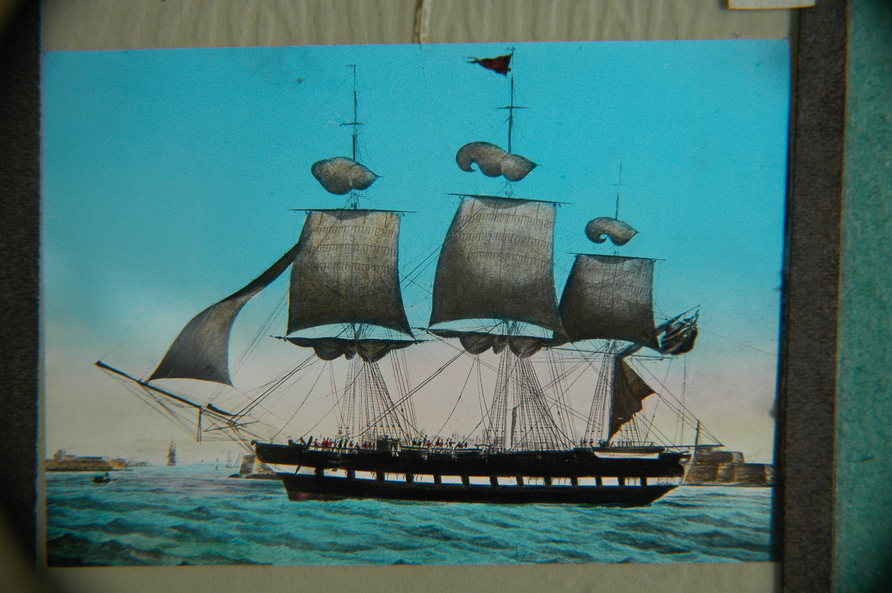 - Photograph of a painting of the "Chapman", The original frame has an inscription: Trasport (sic) Chapman. John Milbank Master _ 558 Tons.