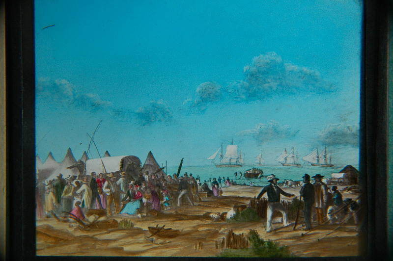 Settlers on shore being greeted by Sir Rufane Shawe Donkin