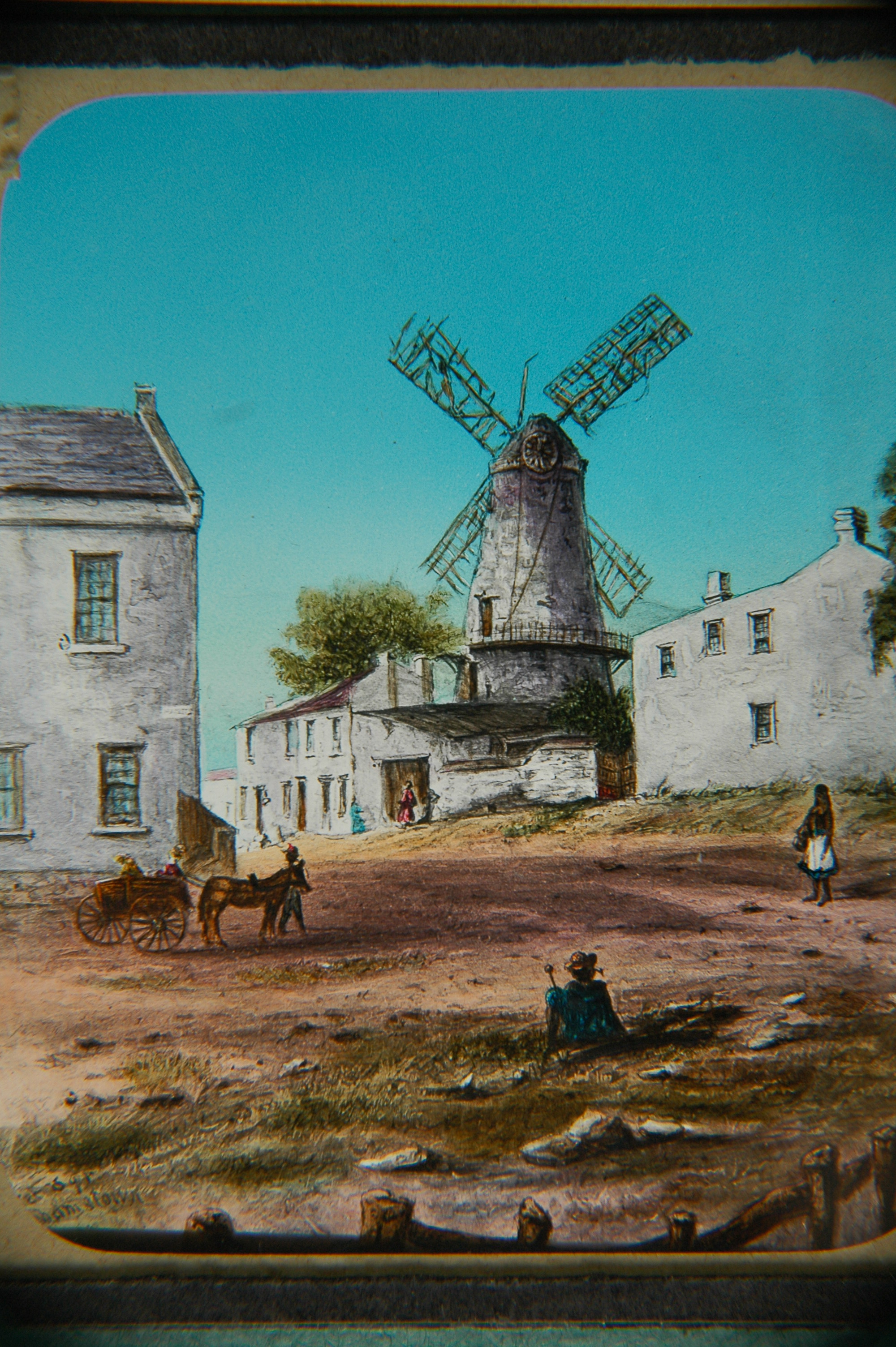 - Painting showing the Old Mill on the corner of George and Market Streets, and on the left corner, the home of Mr George Wood, first Mayor of Grahamstown. The small cart was used to carry Miss Josie Wood (founder of the South African Library for the Blind) to school.