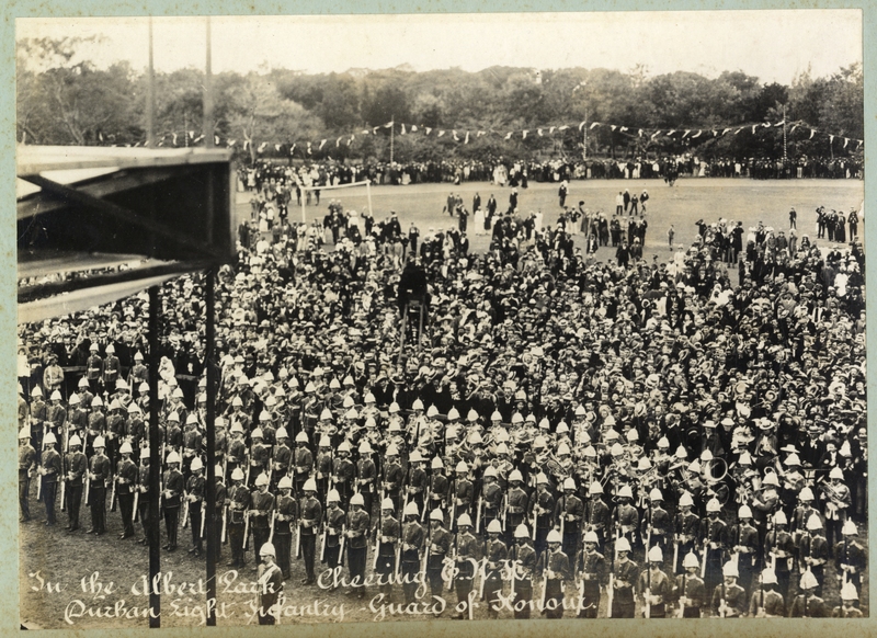 “In the Albert Park, cheering The Royal Highnesses. Durban Eight Infantry Guard of Honour”, Cory Library and Historical Archives, accessed 29 December 2025, https://digitalarchives.ru.ac.za/s/cory/item/6606