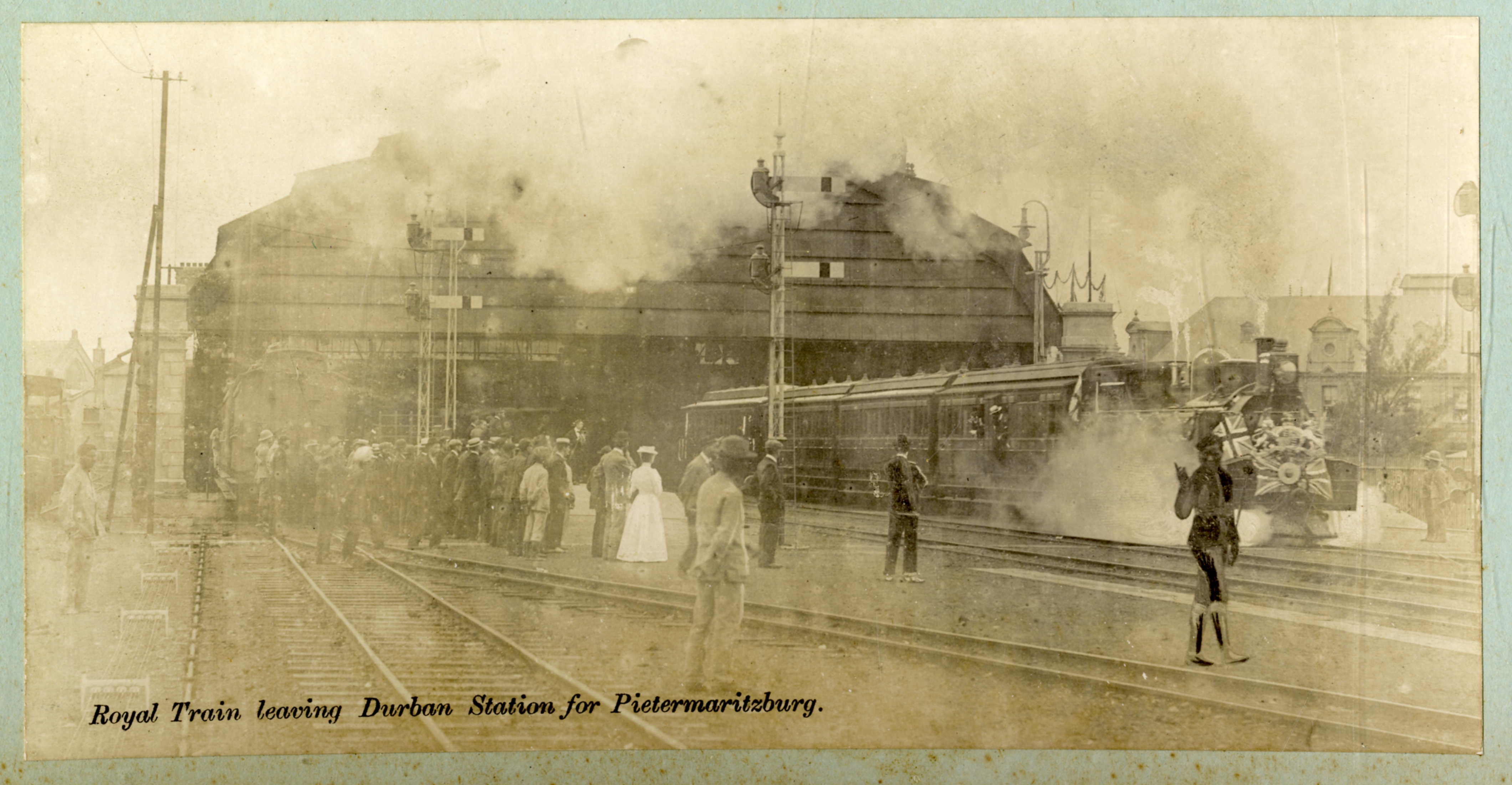 “Royal train leaving Durban station for Pietermaritzburg”, Cory Library and Historical Archives, accessed 29 December 2025, https://digitalarchives.ru.ac.za/s/cory/item/6614