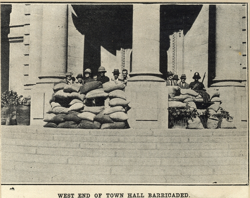 “West End of Town Hall Barricaded”, Cory Library and Historical Archives, accessed 29 December 2025, https://digitalarchives.ru.ac.za/s/cory/item/6900