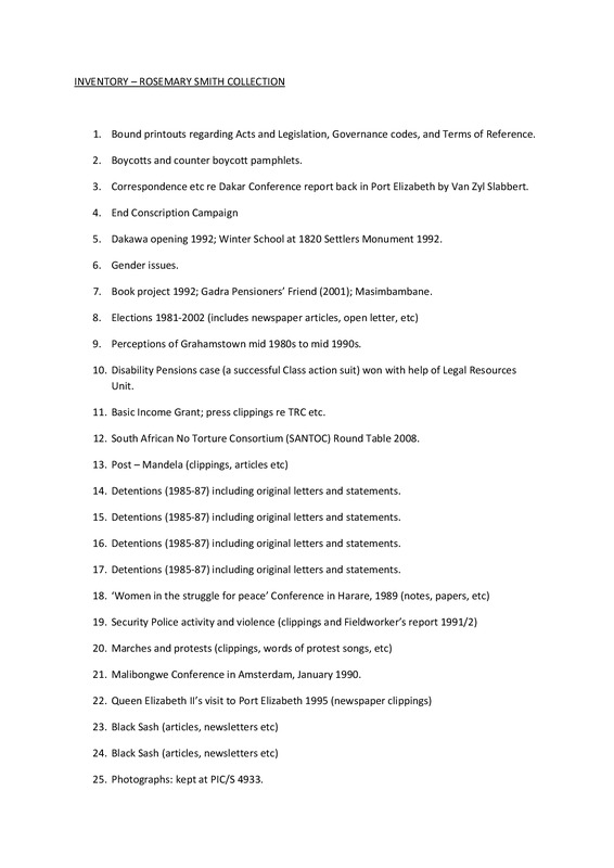 - Inventory of the Rosemary Smith Collection held at the Cory Library for Humanities Research at Rhodes University. The documents (mostly consisting of letters, articles and notes) were collected by Rosemary Smith, and relates to the work of the Black Sash during the Apartheid era in Grahamstown. Includes material relating to elections, detentions, marches and protests etc.
