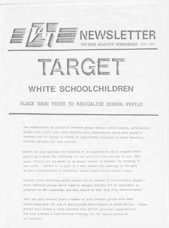 Victims Against Terrorism (South Africa), “Target white schoolchildren: Black Sash tries to radicalise school pupils, VAT Newsletter”, Cory Library and Historical Archives, accessed 28 December 2025, https://digitalarchives.ru.ac.za/s/cory/item/7269