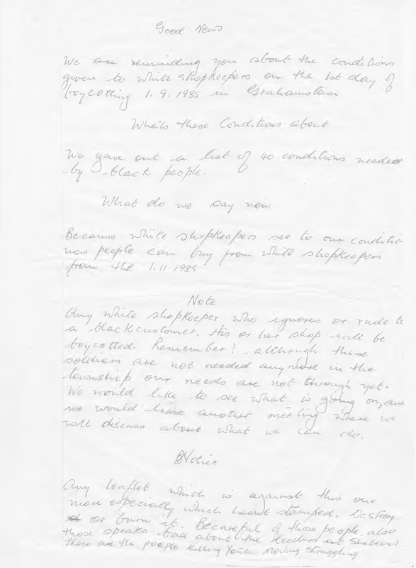 - Handwritten sheet containing notices re the boycotting of white-owned shops, Grahamstown, September 1985. Transcription: “Good News[.] We are reminding you about the conditions given to white shopkeepers on the 1st day of boycotting 1.9.1985 in Grahamstown. Whats these condition about[.] We gave out a list of 40 conditions needed by black people. What do we say now[.] Because white shopkeepers see to our conditions now people can buy from white shopkeepers from the 1.11.1985. Note[.] Any white shopkeeper who ignores or rude to a black customer, his or her shop will be boycotted. Remember! Although these soldiers are not needed anymore in the township our needs are not through yet. We would like to see what is going on, and we would have another meeting where we discuss about what we can do. BNotice[.] Any leaflet which is against this one more especially which wasn’t stamped, destroy or burn it. Be careful of those people, also those speaks bad about the leaders at shebeens[.] Those are the people killing your moving struggling[.] (Transcription - W van der Walt - Rhodes University Library).