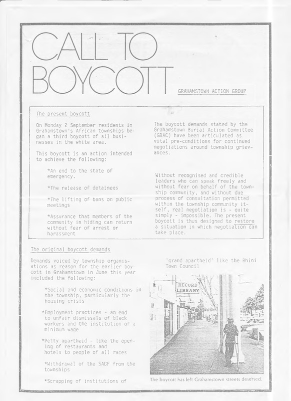 - Pamphlet designed to elicit support from white residents in Grahamstown, in supporting the boycott of white-owned businesses as called by the residents of the "Grahamstown's African townships". The boycott was the third in 1985, and was intended to achieve specific outcomes, such as the end to the State of Emergency, the release of political detainees, and the lifting of the ban on public meetings.