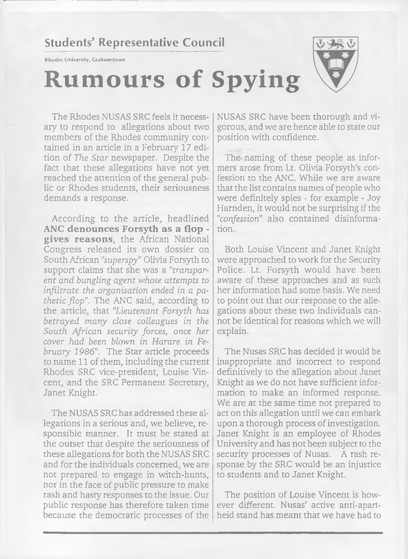 - A response from NUSAS SRC at Rhodes University, about allegations (published in The Star newspaper dated 17 February 1987) about two members of the Rhodes community acting as informants.