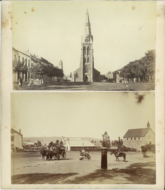 - Two photographs stuck on card, of: (a) View of High Street, Grahamstown, showing the Cathedral of St Michael and St George with the spire, completed in 1878. The Settlers Memorial Tower, completed in 1870, can be seen to the left. (b) View of the intersection of Worcester and Somerset Streets, Grahamstown, with a Victorian fluted pillar box ca. 1859-60 in the foreground, reputed to be the oldest official letter box in South Africa. The house of the Headmaster of St Andrew's College is visible behind it, with Christchurch, built in 1876, in the distance. The latter photograph was taken by Aldham and Aldham, photographers active in Grahamstown from1879-1905.