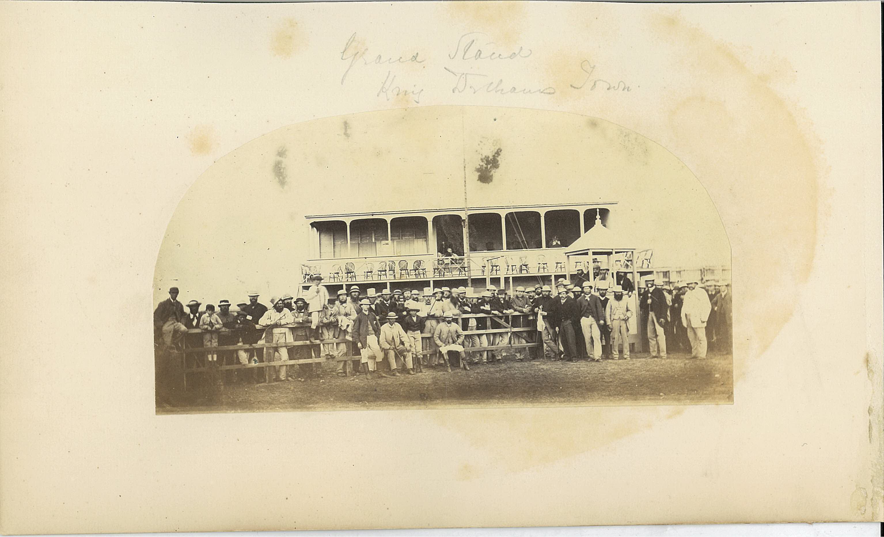 - Although an inscription on the mount describes this as 'Grand stand, King William's Town', the building in question is however identical to that in a photograph by F.W. Hepburn of a race meeting in Grahamstown, taken in 1864, and held in the van der Riet collection at Cory Library.