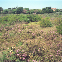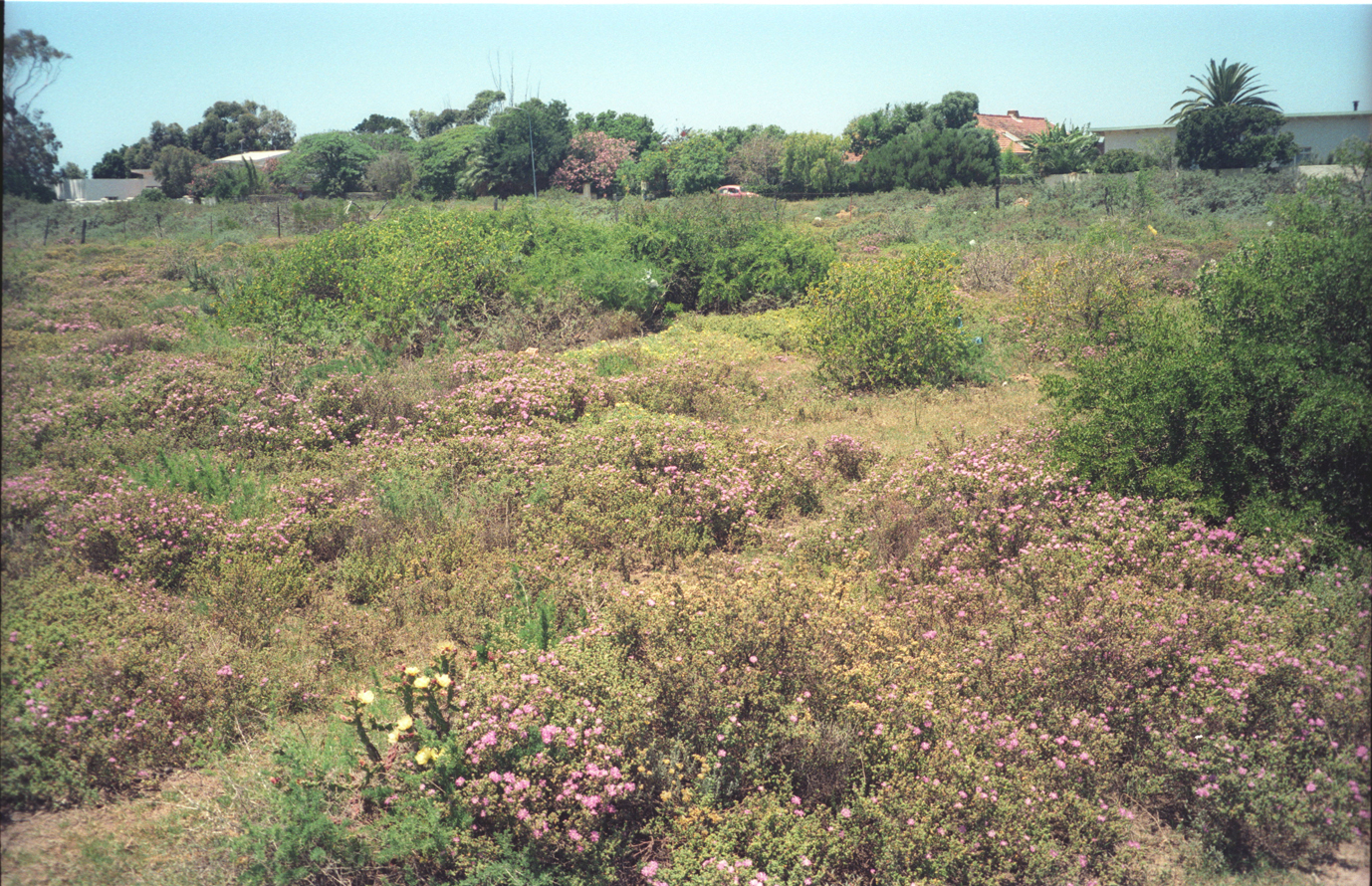 - Dense stand of Ruschia rigens with a fine-flowering plant of jointed-cactus, Opuntia aurantiaca, in foreground (whitish, actually pale yellow in life). Much of this overgrazed camp is covered in this way.
