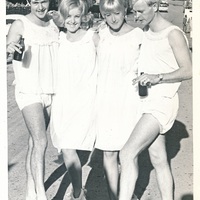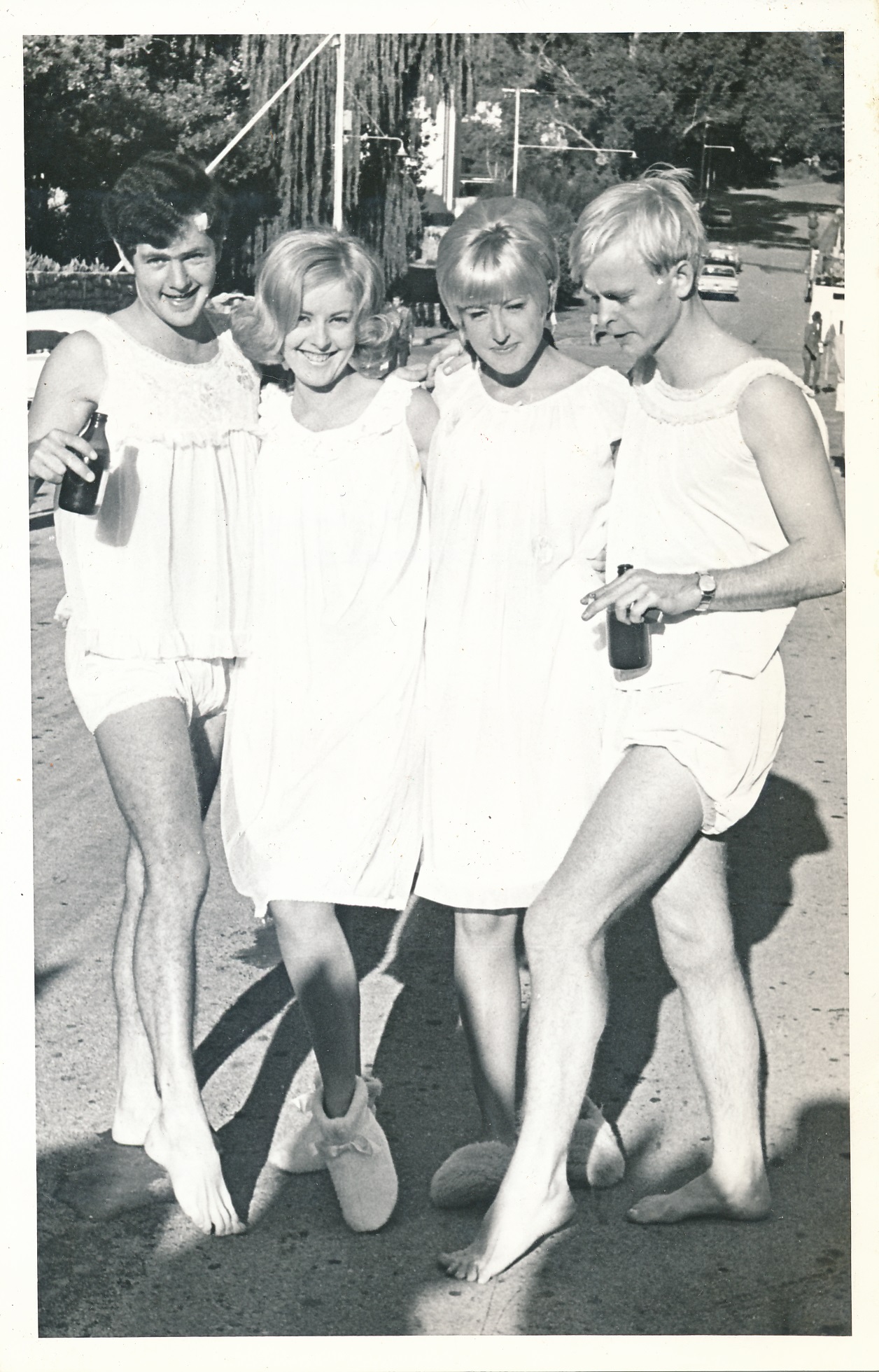 Gordon, Helen Harroway, Di Lewis and a young man during Rag week, 1966