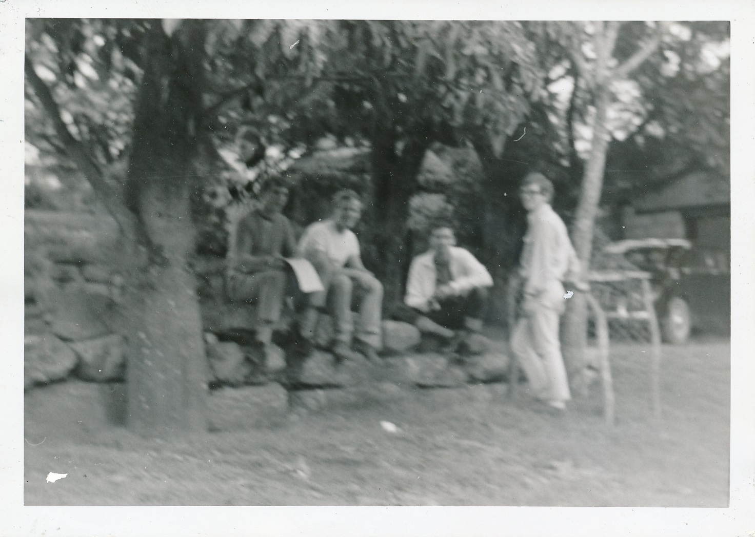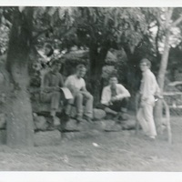 Group of young men sitting outside at the University Christian Movement Camp, 1968