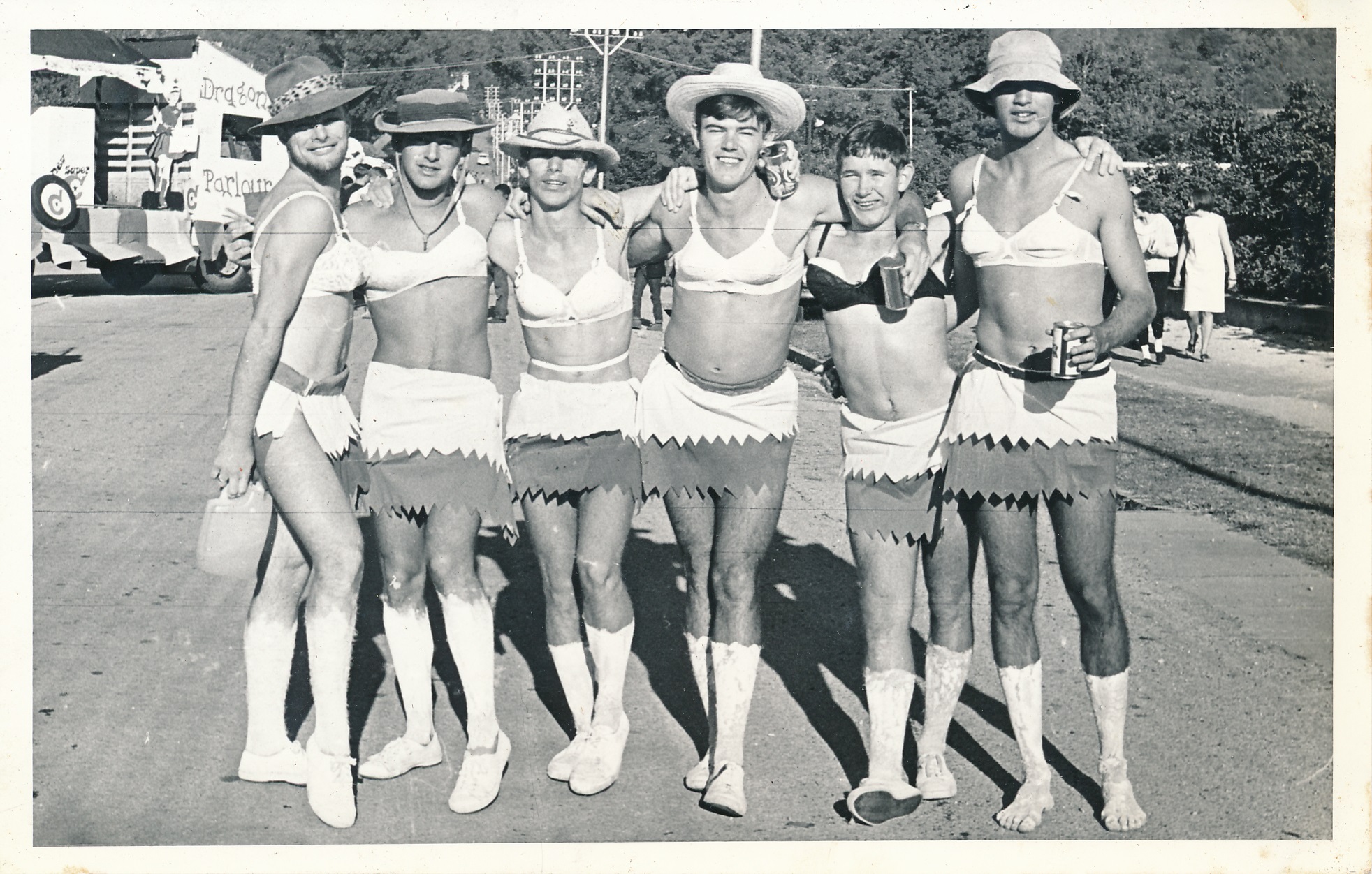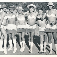 Pete Cleary and Des Bromwell with young men of bum majorettes