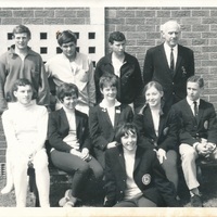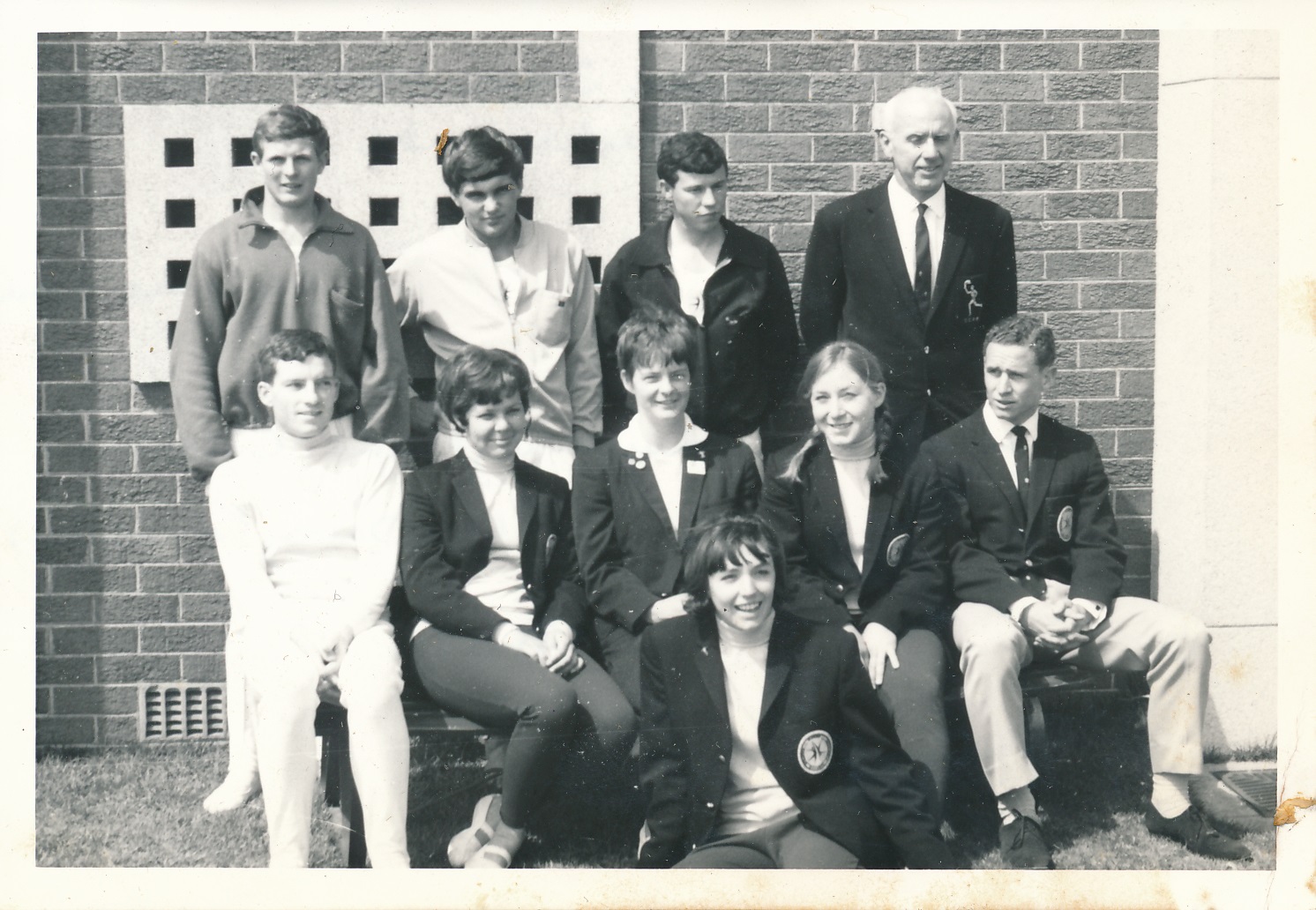 - Border Gymnastics team at Nationals in Johannesburg - Formal photograph of young people wearing blazers with an unknown insignia on them. Jeff Dyer standing on far left. Professor Locke (coach) standing on far right. Seated, left to right: unknown man, Lynn Edley, Buddy Hanley (coach), Gail Martin, Ant Davey (manager). Babs Phillips seated on ground in foreground of photograph.