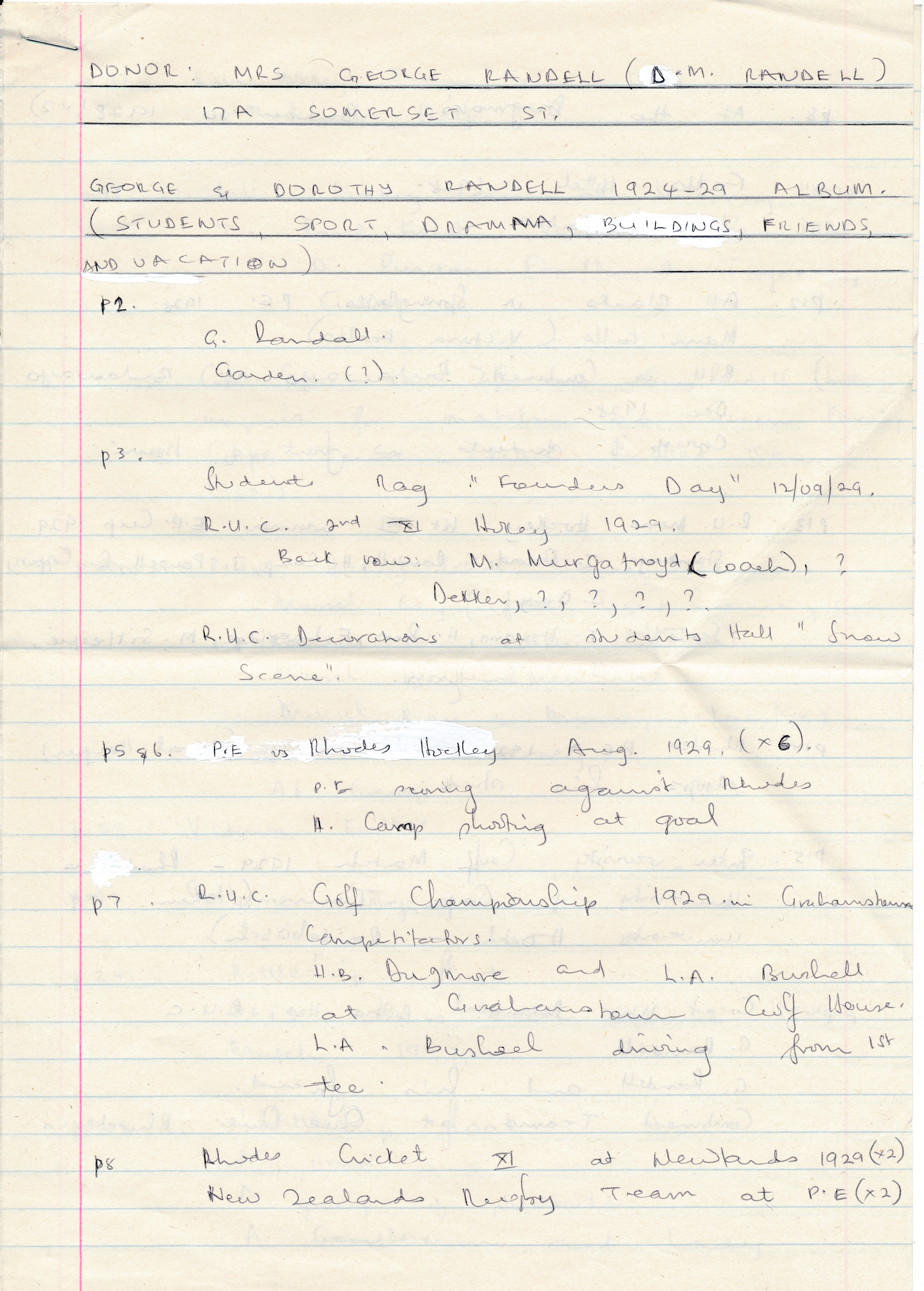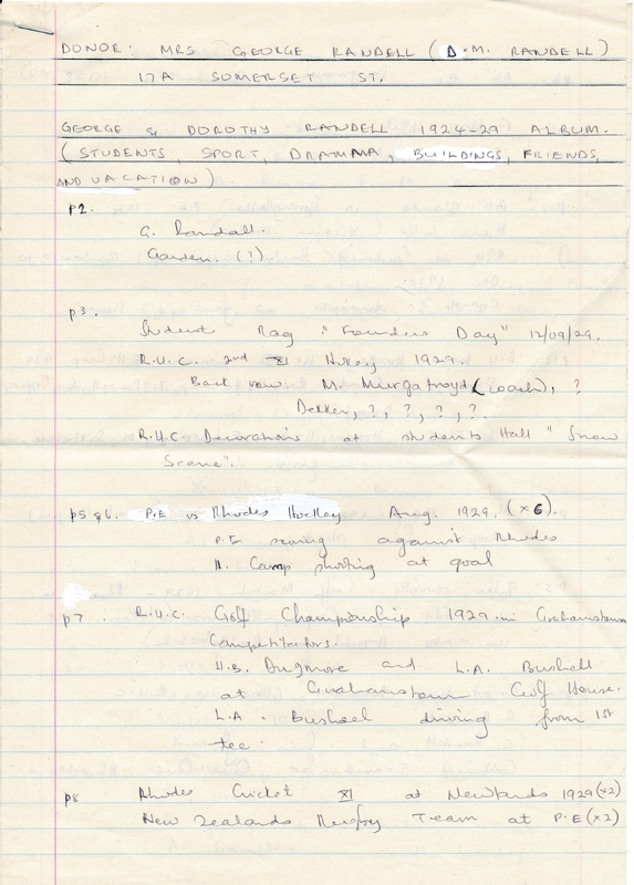 - A collection of photographs donated by Dorothy Randell. Period 1924-1929. Photos of sports, holidays, friends, buildings and other activities of the Randells.