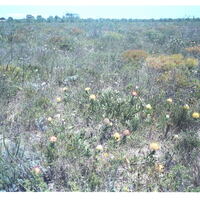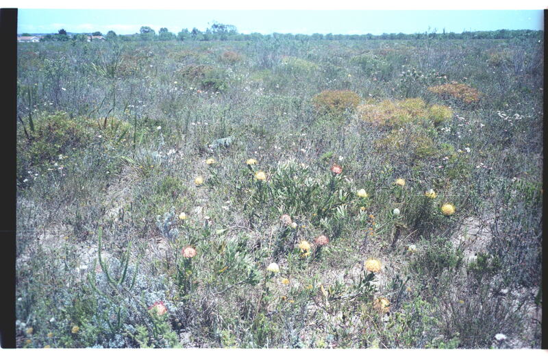 - Cluster of Leucospermum cuneiforme in an open grassy-fynbos field almost certain to disappear under housing in due course, a fine area for wild flowers in all seasons. This field is a good example of what natural veld in this district used to be. Bridgemead suburb in left background.