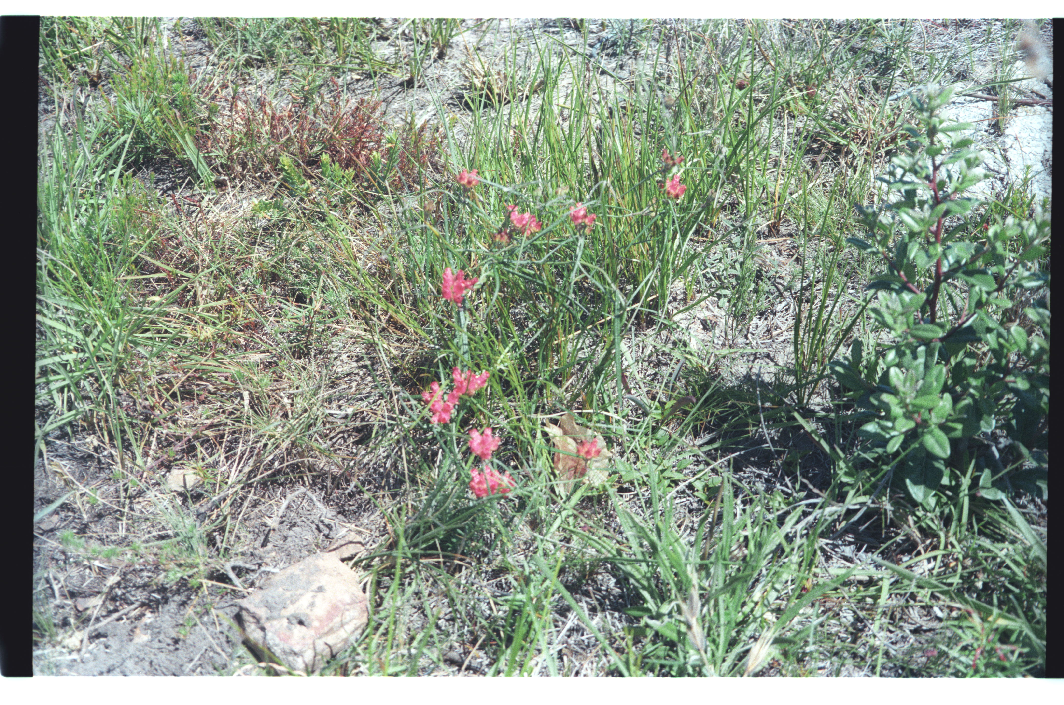 - Single plant of Microloma tenuifolium, 'Waxie' or Waxcreeper, climbing on grass stools. This area of natural open mixed fynbos grass on Parson's Vlei (Kuyga Flats) will almost certainly disappear under housing which had already encroached 50m of where this photograph was taken.