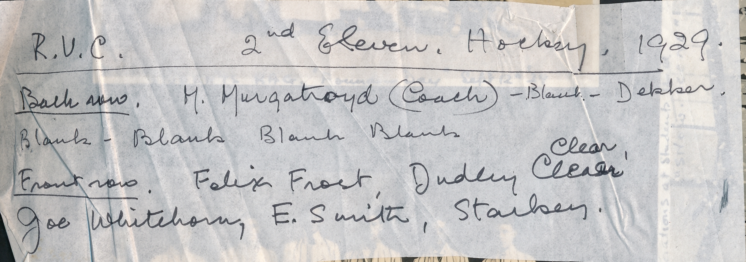 “Rhodes University College 2nd XI Hockey 1929 name list”, Cory Library and Historical Archives, accessed 29 December 2025, https://digitalarchives.ru.ac.za/s/cory/item/8685