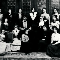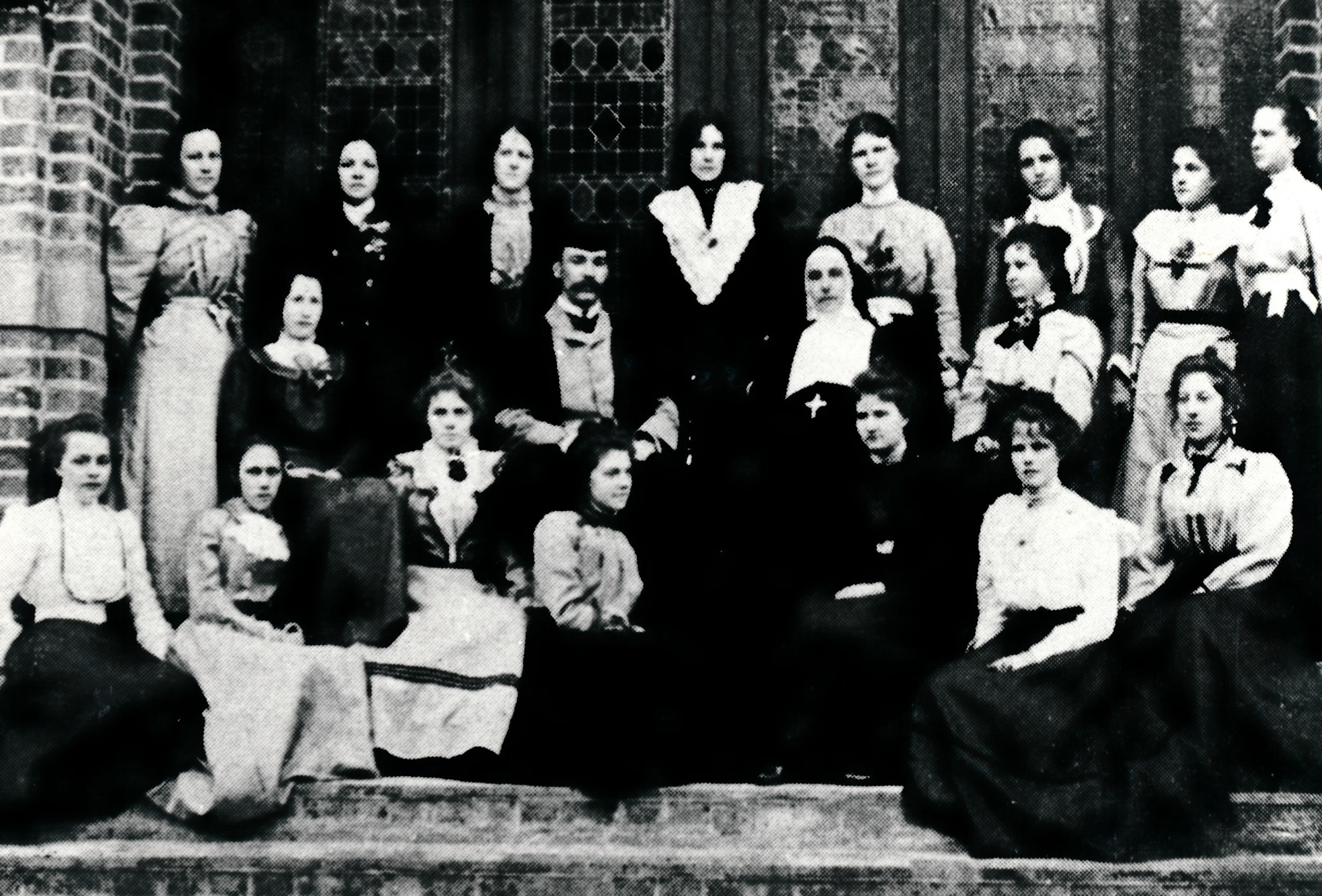 First Principal of the Grahamstown Training School, Mr Rankin, with Sr Marion and leaving students on the steps of St. Peter's Home 1901
