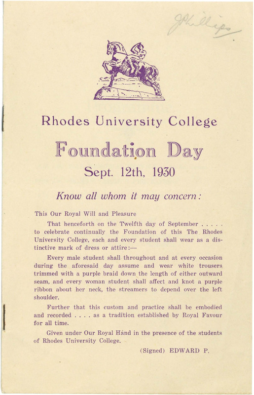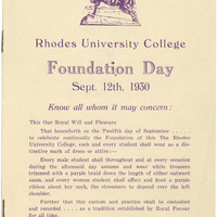 “Rhodes University College - Foundation Day, September 12th, 1930 (Programme)”, Cory Library and Historical Archives, accessed 28 December 2025, https://digitalarchives.ru.ac.za/s/cory/item/9038