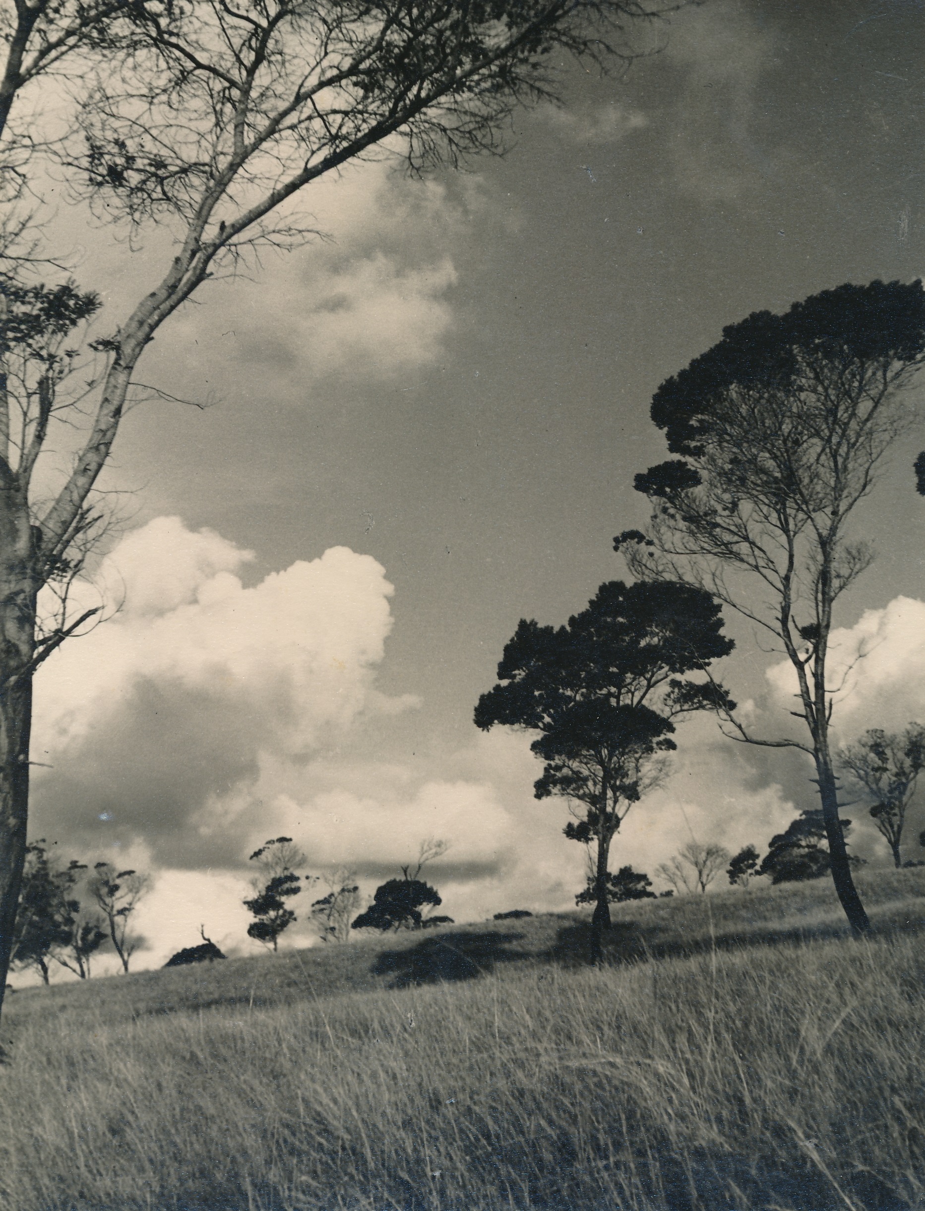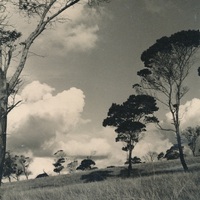 - Photograph of a hillside dotted with several trees. An approaching storm can be seen in the background.