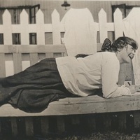 - Photograph of a woman lying in stool with her books