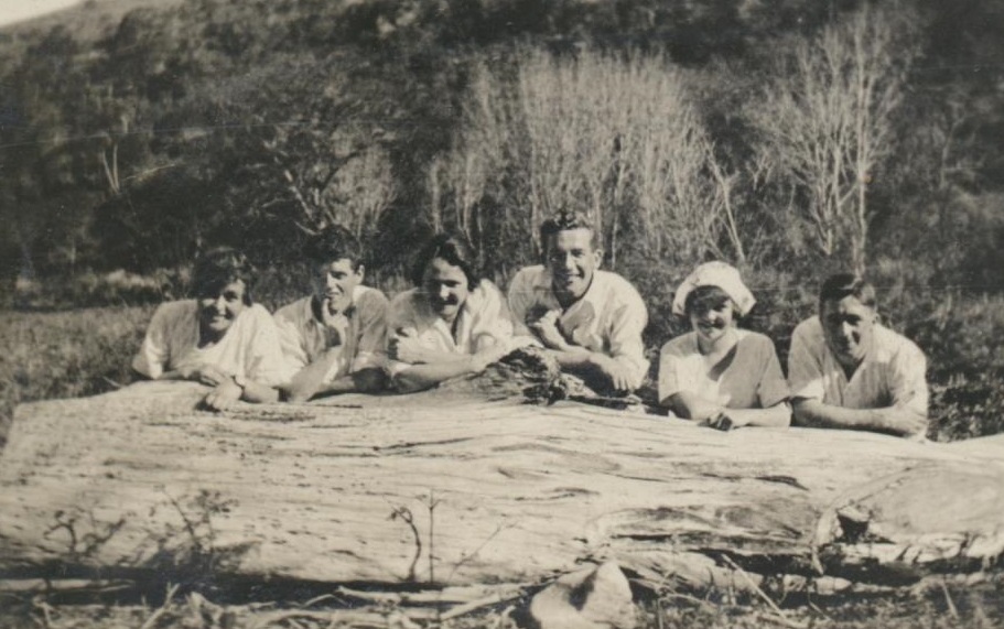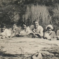 - Group photograph of six people lying on the ground