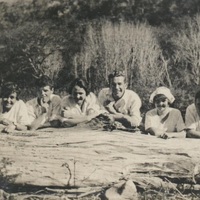 - Group photograph of six people lying on the ground