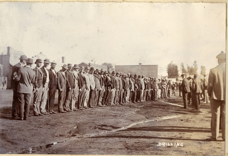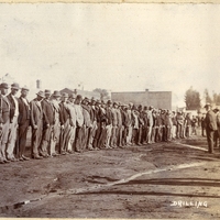 - Photograph entitled "Drilling" showing a group of men lining up in drill formation