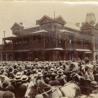 - Photograph entitled "Rand Club, Johannesburg: Sir Jacobus de Wet addressing the crowd" showing a large group of people in front of, and on the balcony of, the Rand Club in Johannesburg