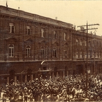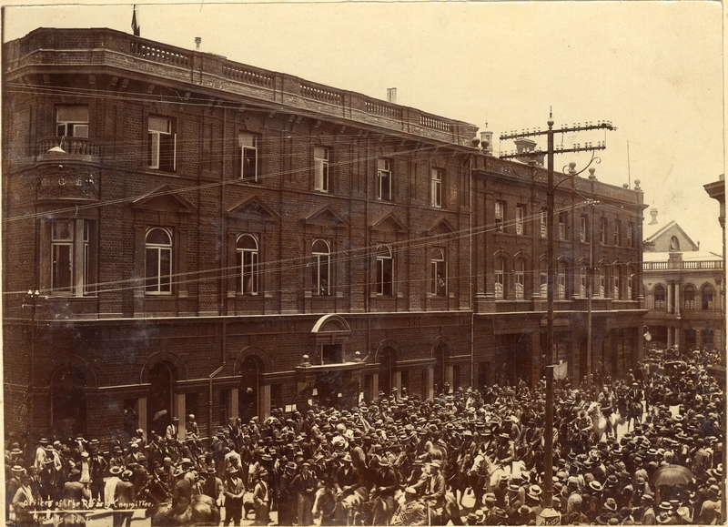 - Photograph entitled "Officers of the Reform Committee" showing a large group of people in front of the offices of Charles Leonard, Attorney at Law, who was the leaders of the Uitlanders. Below the photograph are the words "Consolidated Gold Fields".