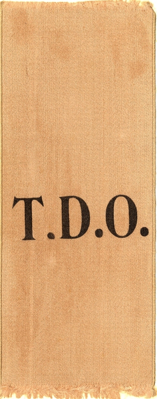 Badge of khaki-coloured silk with the letters "T.D.O" in black thread