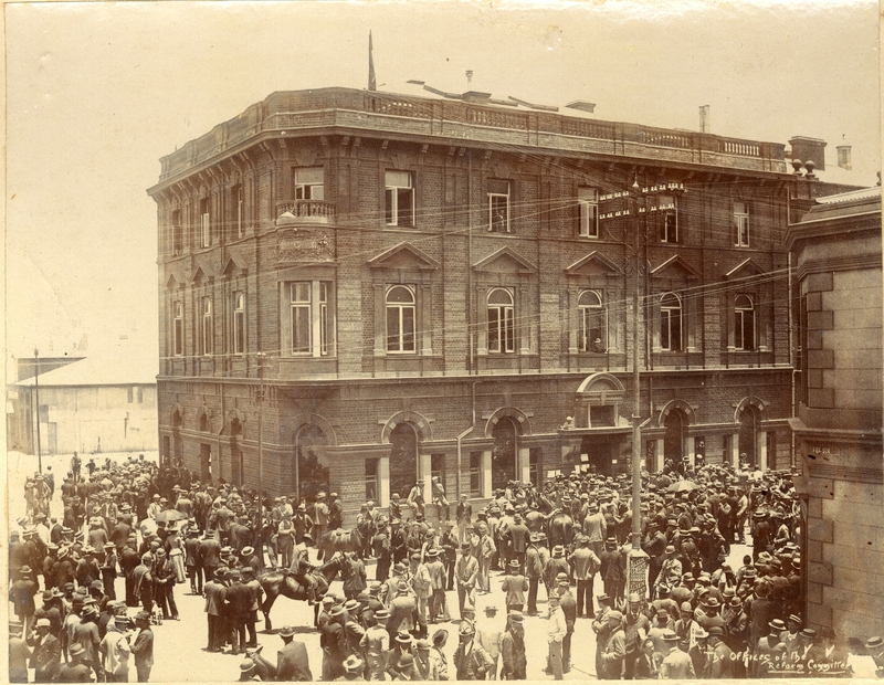 - Photograph entitled "The Offices of the Reform Committee" showing a large group of people in front of the offices of Charles Leonard, Attorney at Law, who was the leaders of the Uitlanders.