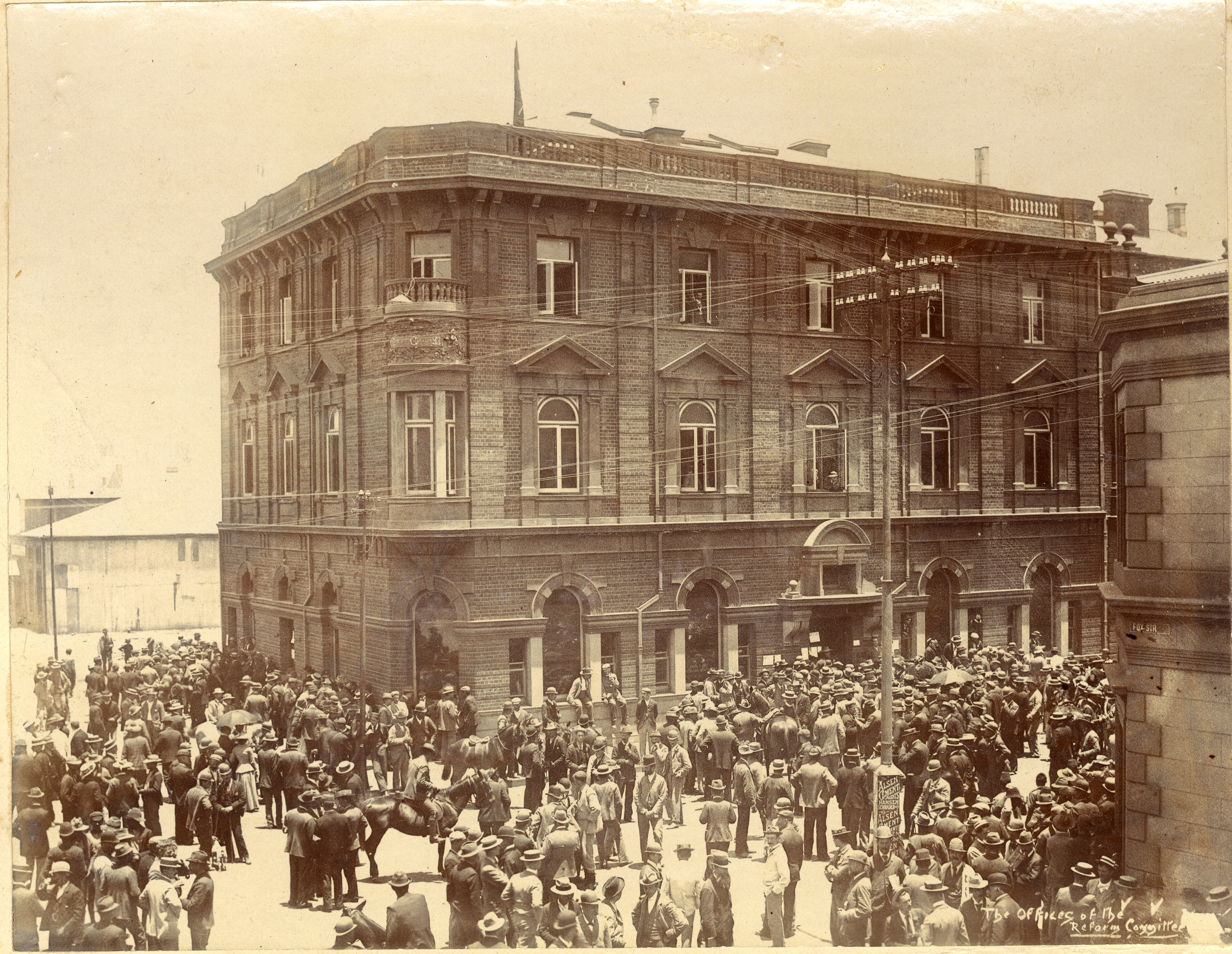 Nicholls, Horace W. (Horace Walter), 1867-1941, “Photograph entitled "The Offices of the Reform Committee"”, Cory Library and Historical Archives, accessed 28 December 2025, https://digitalarchives.ru.ac.za/s/cory/item/9378