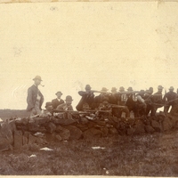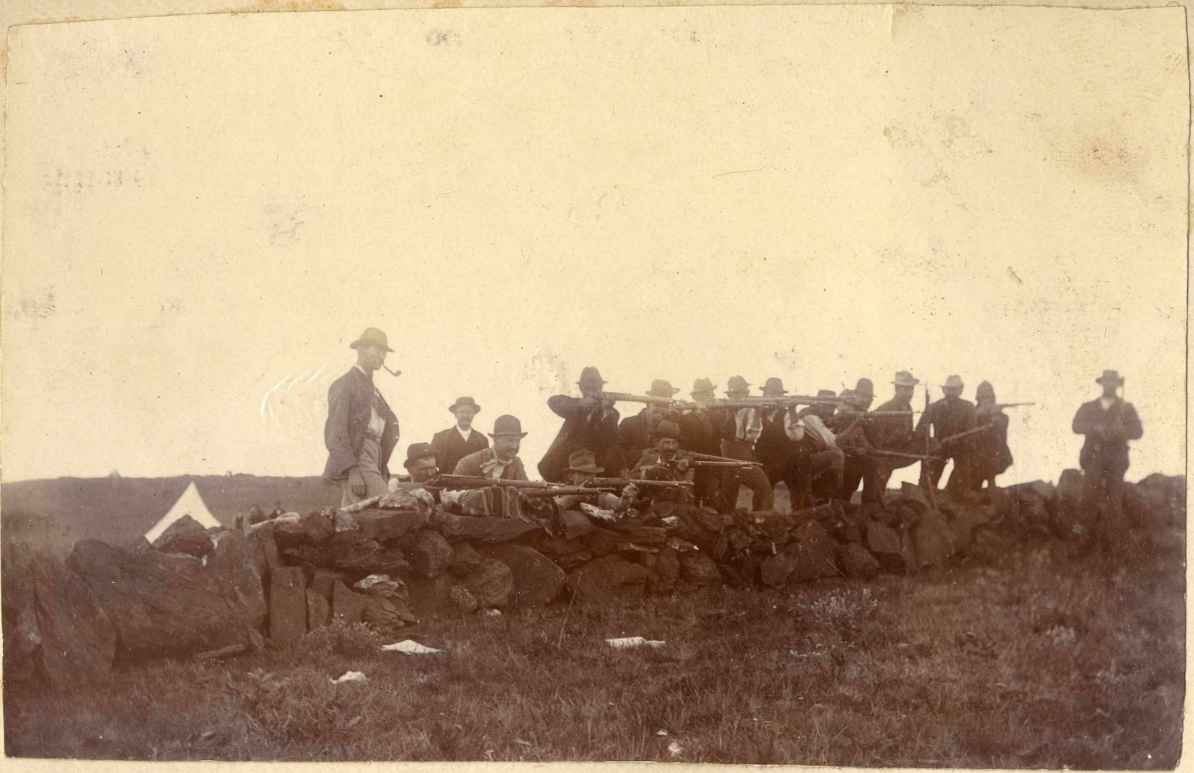 - Photograph entitled "Firing practice" showing a group of men firing their rifles in a field.