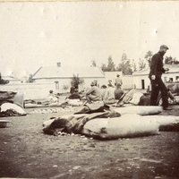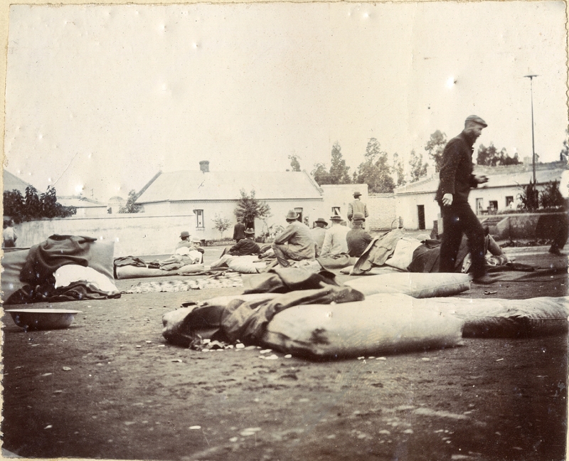 - Photograph entitled "Airing bedding" showing a small group of men airing the bedding in a small square surrounded by a few buildings.