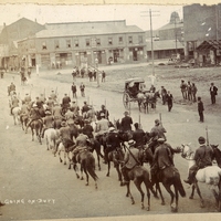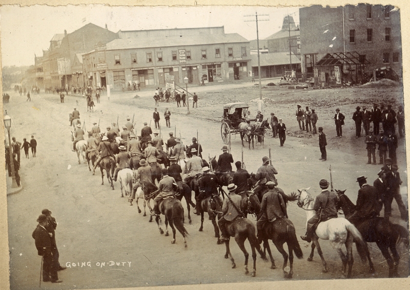 - Photograph entitled "Going on duty" showing a number of armed men on horseback riding down a street.