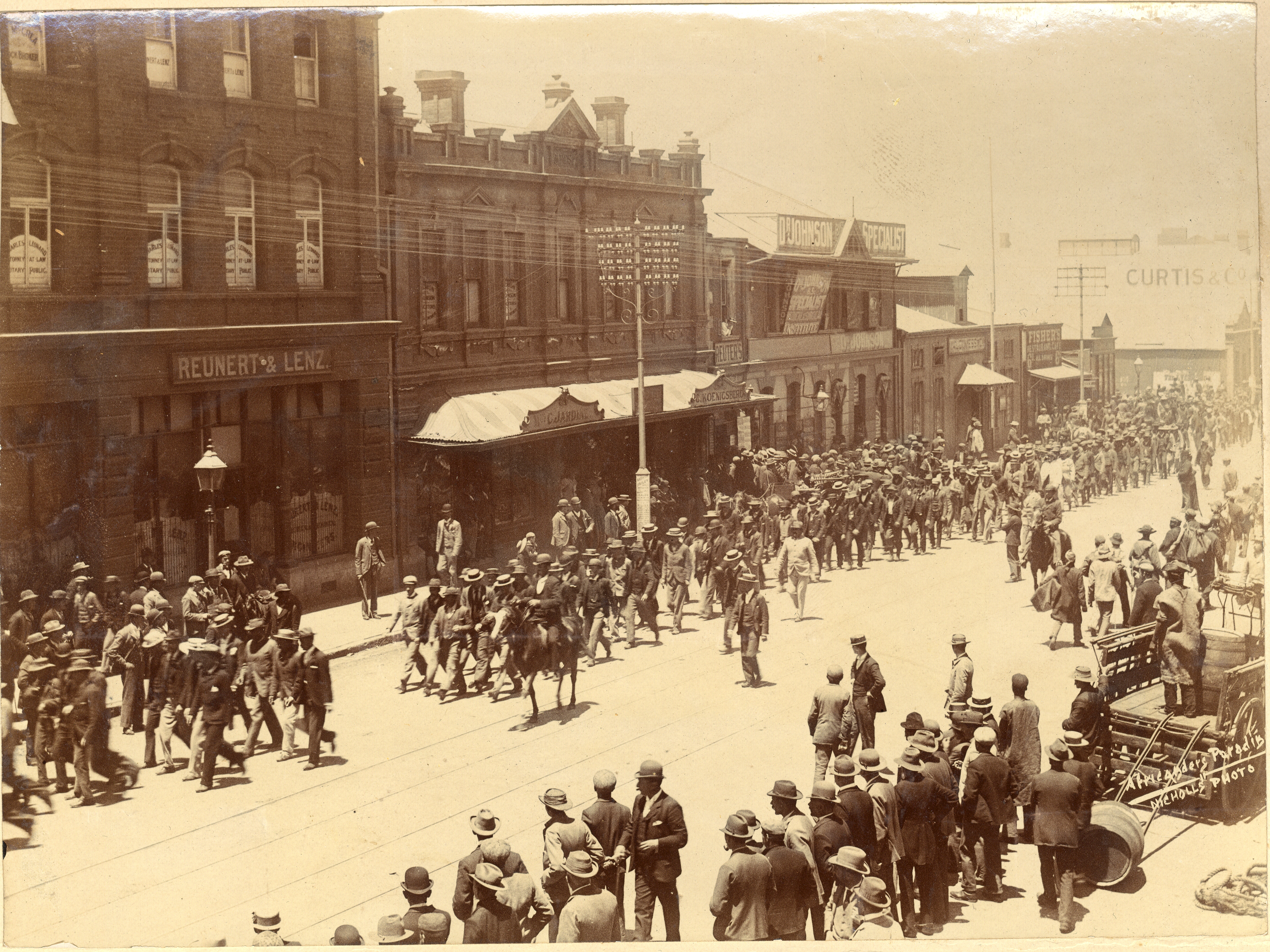 - Photograph entitled "Africanders parading" showing a large group of men marching down a Johannesburg street past Reunet and Lenz, Electrical Engineers. The photograph is signed by Nicholls.