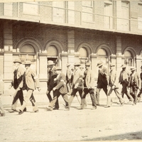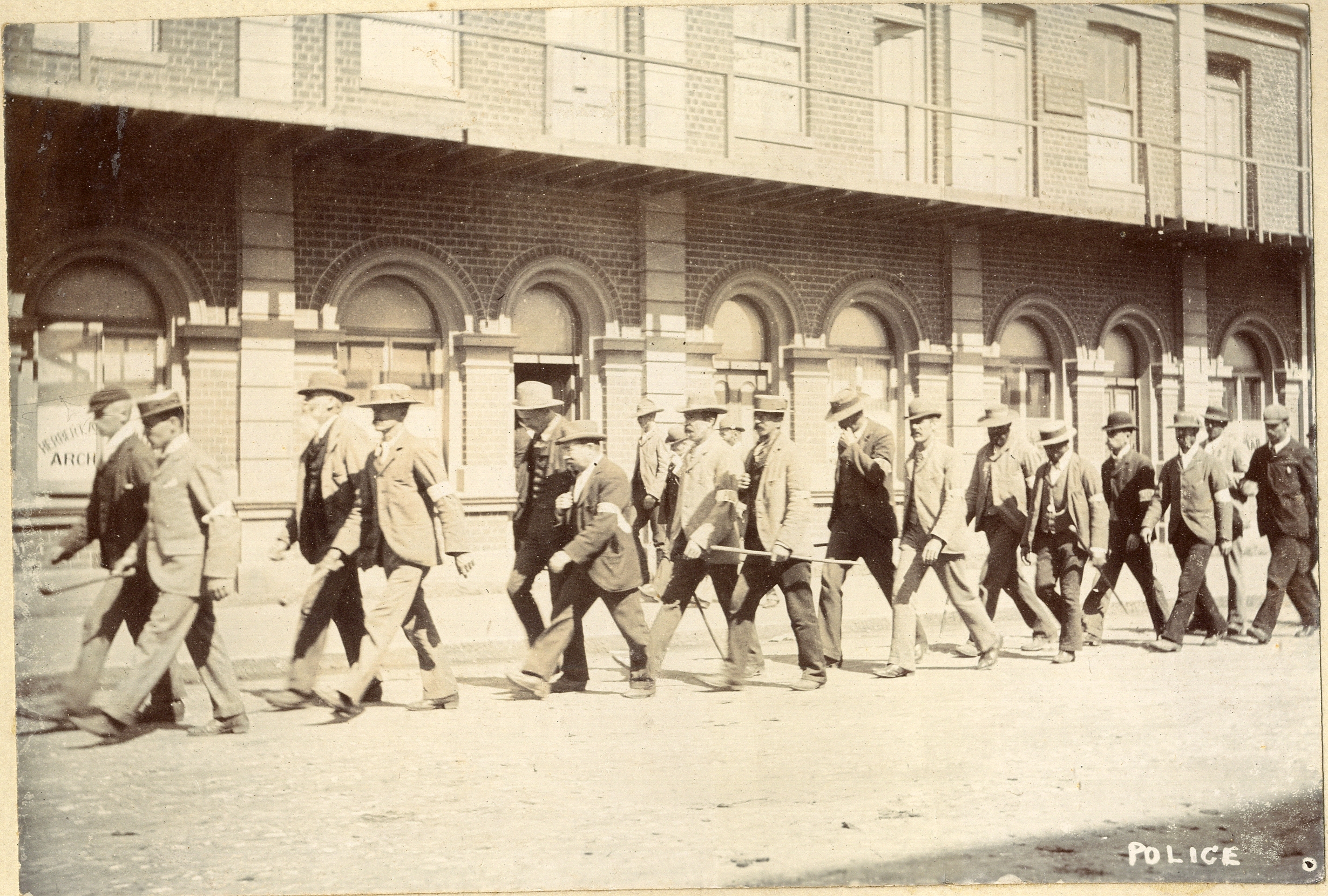 - Photograph entitled "Police" showing a group of policemen marching down a street. They are in plain clothes and are wearing white bands printed with the word "Police" around their left arms.