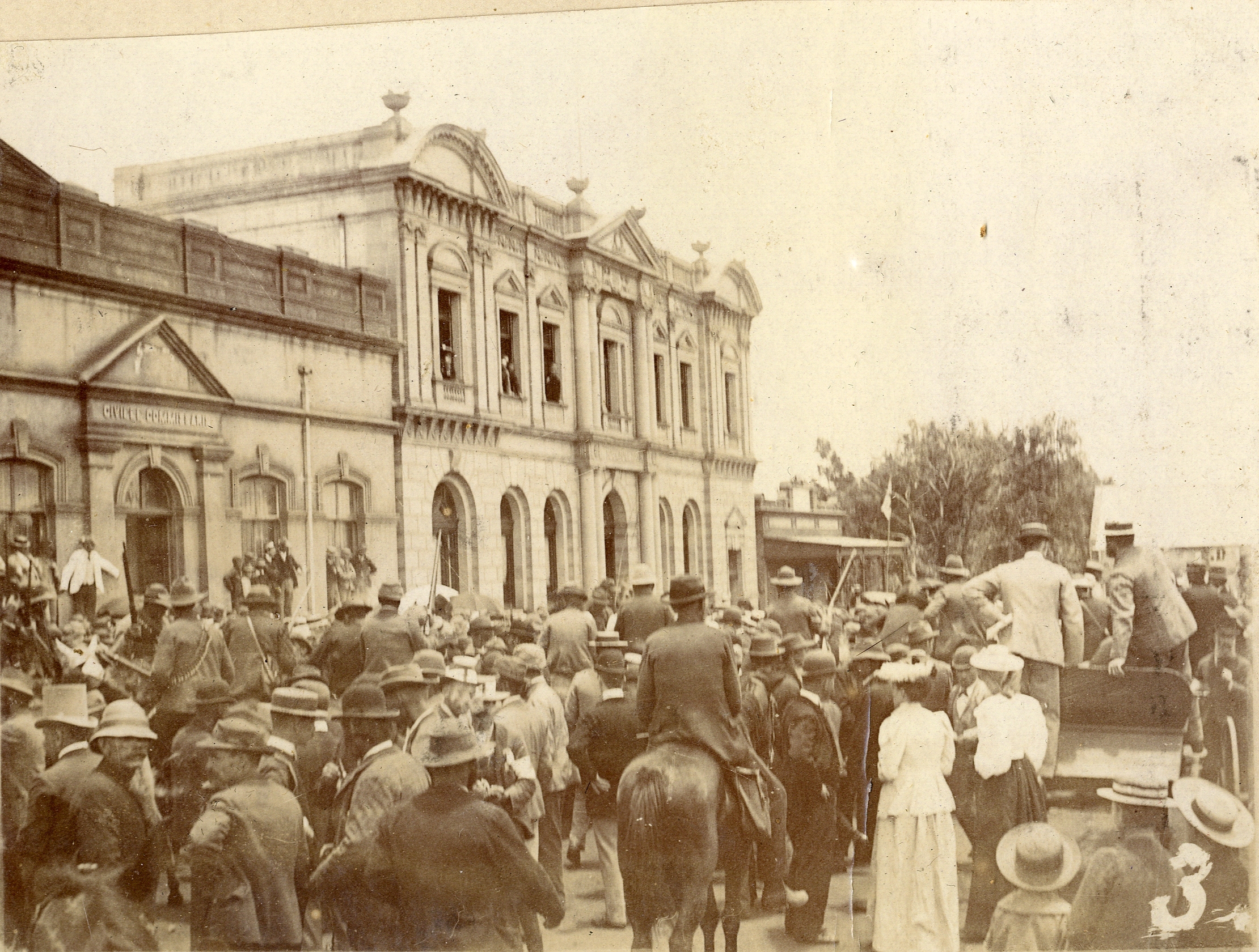 - Photograph entitled "Pretoria" showing a group of men, mostly armed, and some on horseback gathering a Pretoria street in front of the Civiele Commissaris, Pretoria. There are a few women in the foreground.