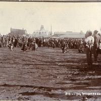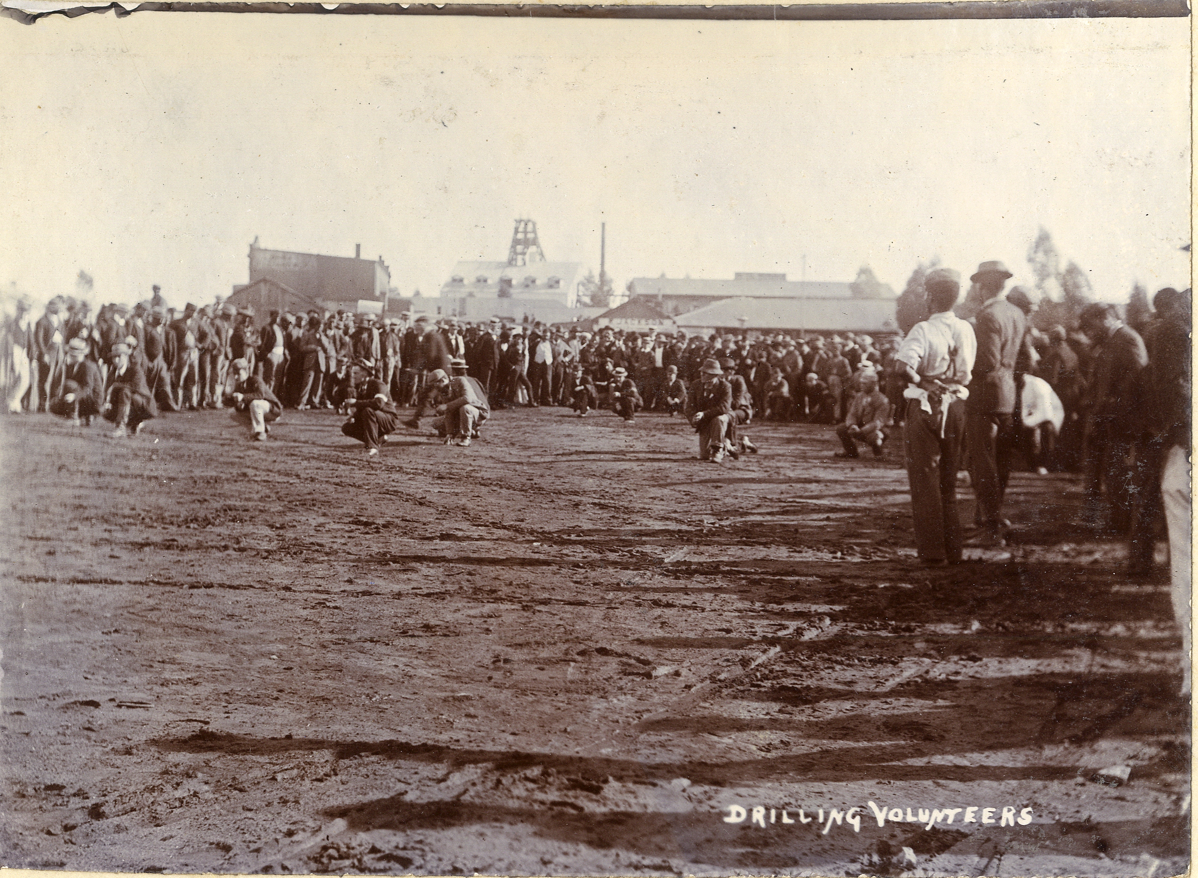 - Photograph entitled "Drilling volunteers" showing a large group of men gathered in a mining yard. The name "M. Jackson" is on one of the buildings in the background.