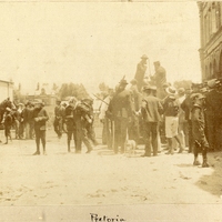 - Photograph entitled "Pretoria" showing a group of men, some armed and some on horseback, on a Pretoria street.