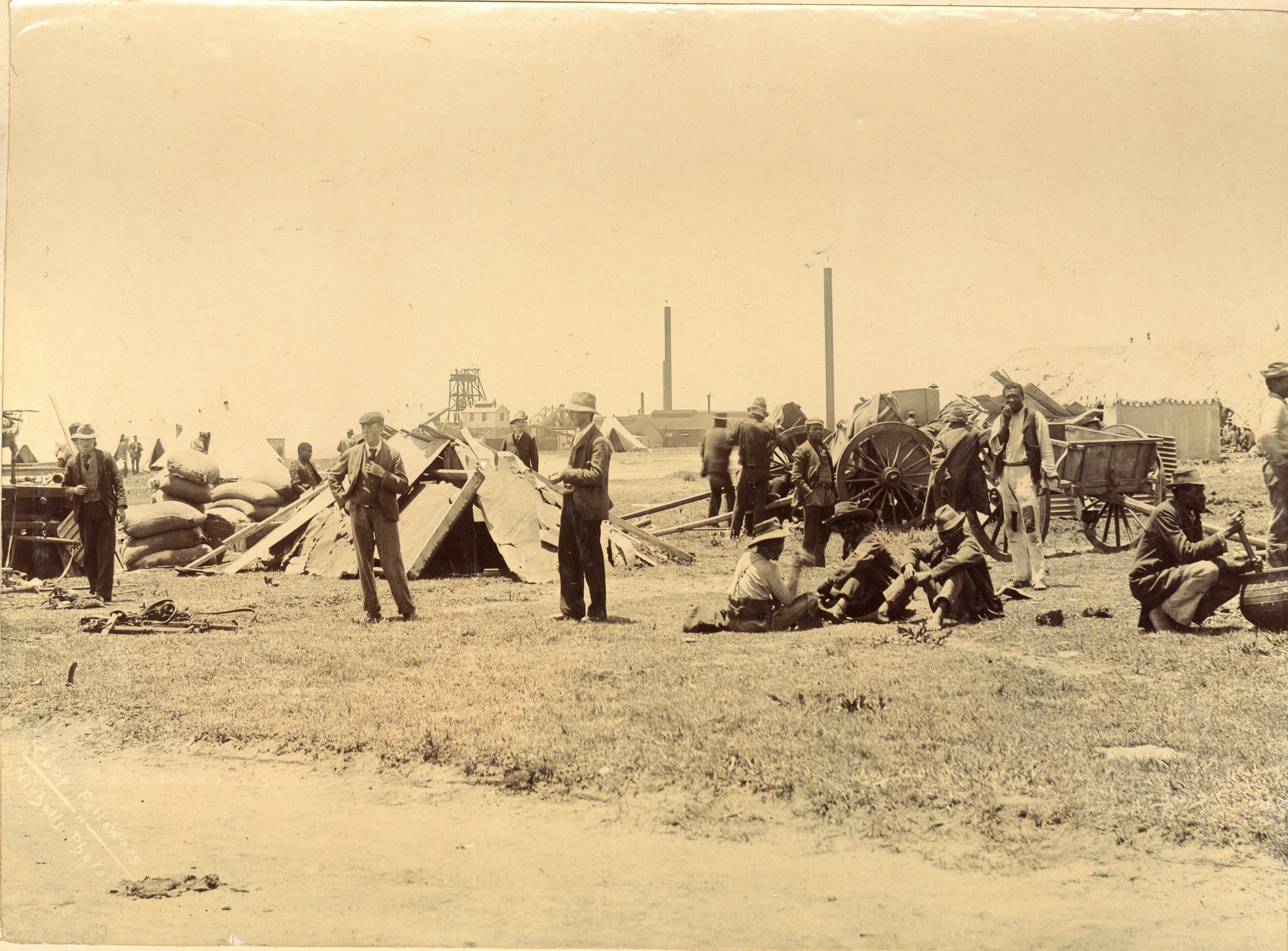 - Photograph entitled "Troop followers - Village Main Reef Camp" showing a group of men in a mining camp containing tents and a wagon.
